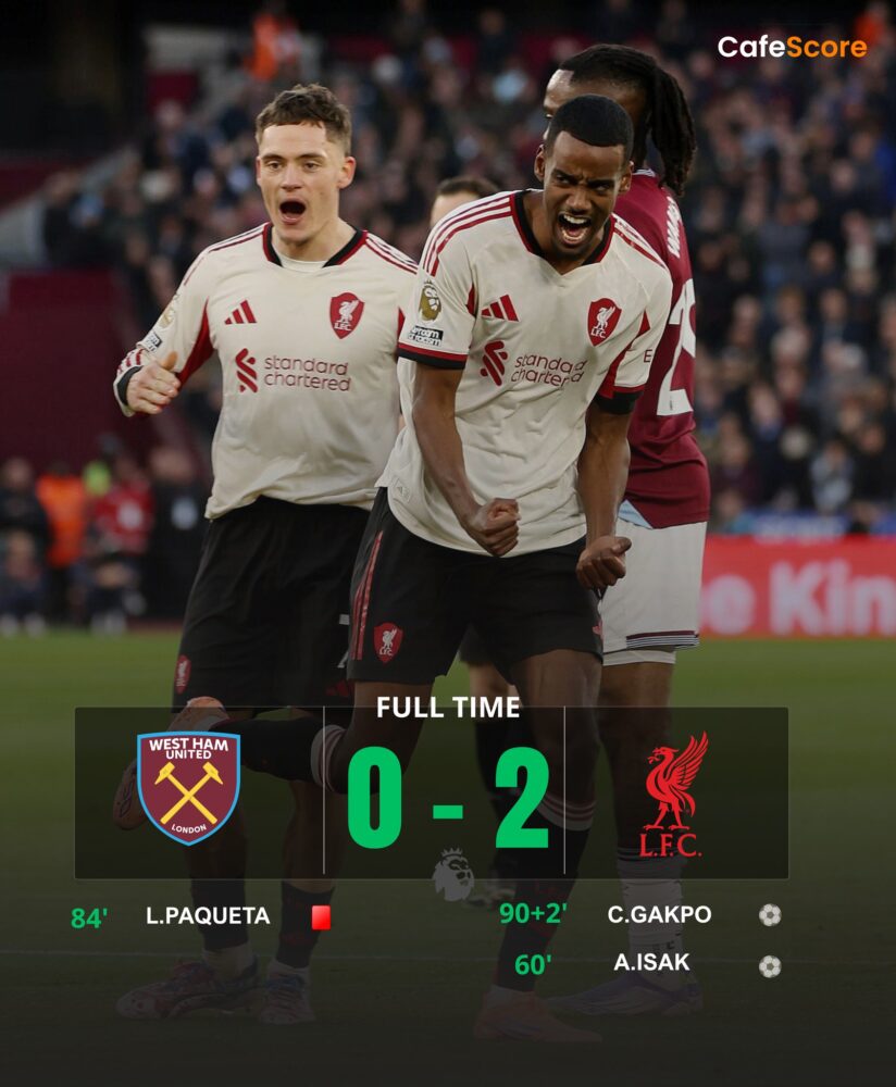 Liverpool care suferise 6 înfrângeri în 7 meciuri din Premier League a câştigat în sfârşit (2-0) la West Ham United. O victorie mult aşteptată, concretizată prin golurile lui Alexander Isak (min. 60) şi Cody Gakpo (min. 90+3). Internaţionalul suedez Isak a marcat primul său gol, în Premier League, după ce marcase doar în Cupa Ligii, la 23 septembrie a.c. (2-1 cu Southampton). Partida de ieri a mai marcat un eveniment: după 53 de meciuri consecutive, ca titular, Salah a început partida ca rezervă. Să mai consemnăm şi faptul că brazilianul Lucas Paqueta (min. 83) a fost eliminat de pe teren, pentru proteste. Alte rezultate: Chelsea – Arsenal 1-1, Nottingham – Brighton 0-2, Aston Villa – Wolverhampton 1-0, Crystal Palace – Manchester United 1-2.