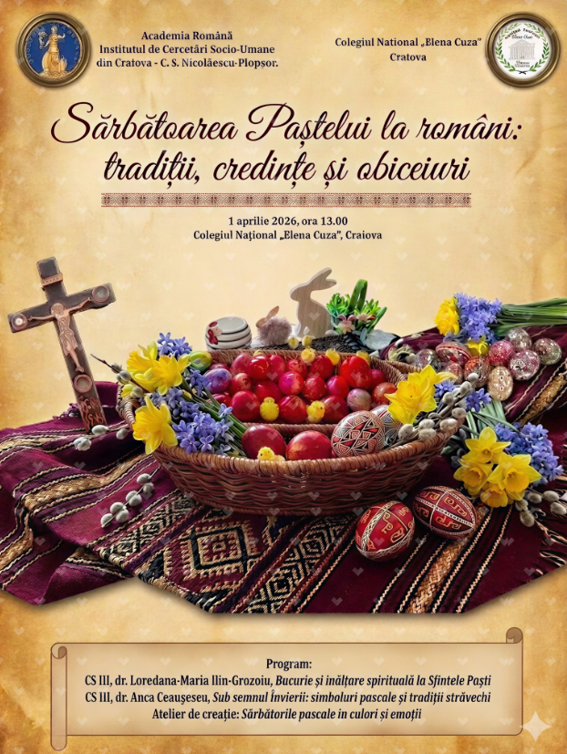Desfășurat în cadrul Protocolului de colaborare, proiectul „Sărbătoarea Paștelui la români: tradiții, credințe și obiceiuri” (responsabili: cercet. șt. III dr. Anca Ceaușescu, prof. Marinela Valentina Calangiu) reunește expertiza academică a cercetătorilor de la Institutul de Cercetări Socio-Umane din Craiova – C.S. Nicolăescu-Plopșor și experiența pedagogică a cadrelor didactice de la Colegiul Național „Elena Cuza” din Craiova. La eveniment, desfășurat miercuri, 1 aprilie 2026, au participat elevi ai acestei instituții de învățământ, coordonați de către prof. Marinela Valentina Calangiu.