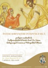 Evenimentul va avea loc începând cu ora 14:00, la Centrul „Renașterea”, situat pe Strada “Matei Basarab”, nr. 17, din Craiova. Prelegerea va fi susținută de Înaltpreasfințitul Părinte Dr. Irineu, Arhiepiscopul Craiovei şi Mitropolitul Olteniei, care va vorbi despre semnificația profundă a Învierii Domnului și despre importanța renașterii duhovnicești în viața fiecărui creștin. Conferinţa duhovnicească este organizată de Arhiepiscopia Craiovei și Facultatea de Teologie din Craiova. ,,Vă așteptăm cu dragoste și nădejde, pe toți fiii duhovnicești ai Arhiepiscopiei noastre, să ne adunăm în comuniune de rugăciune și ascultare, spre a primi cuvânt de învățătură ziditoare de suflet al Arhipăstorului nostru. Să ne deschidem, așadar, inimile și cugetele pentru a asculta