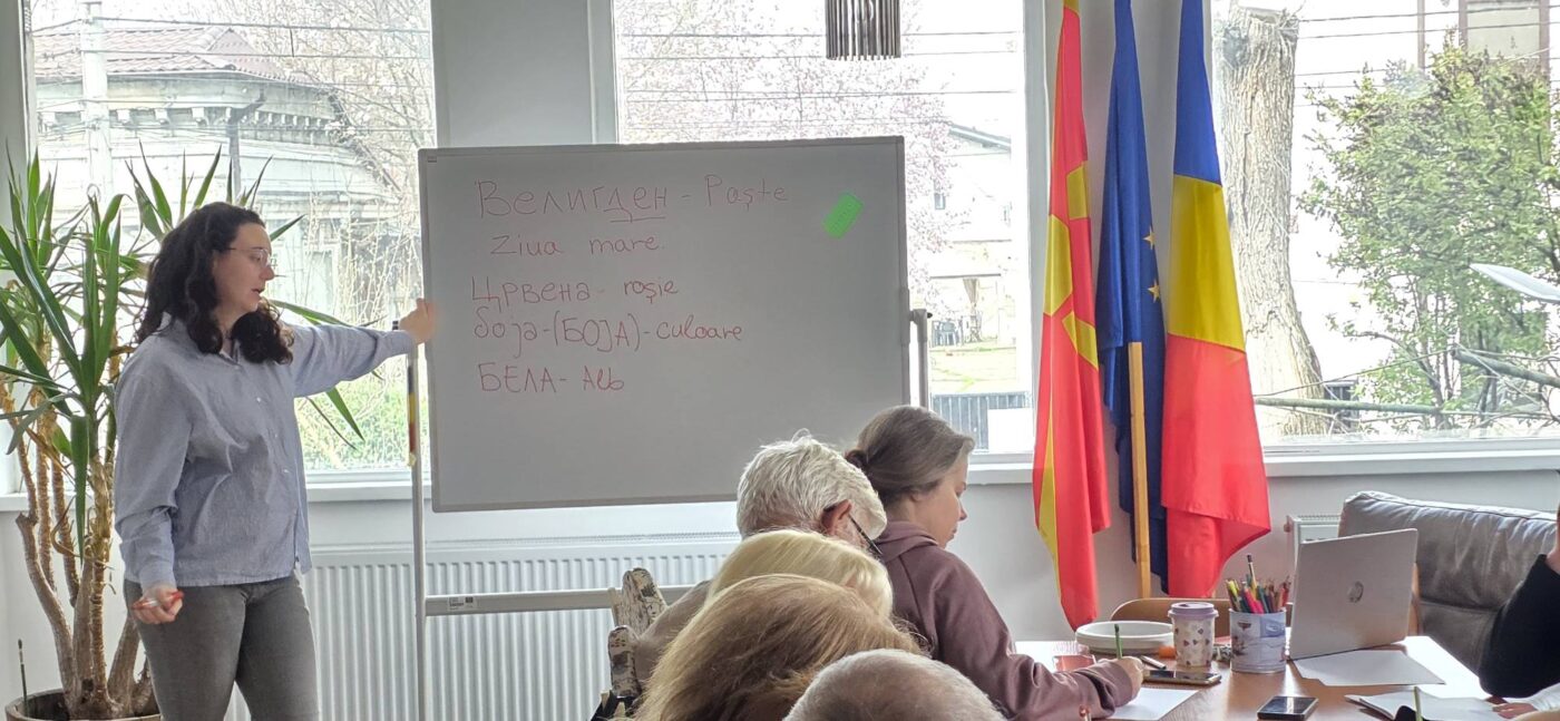 Cursul de limbă macedoneană, susținut de doamna profesoară Elena Saul Nikolova, a reunit participanți de toate vârstele, precum și pe domnul deputat Ionel Stancu, uniți de dorința de a descoperi semnificațiile profunde ale acestei perioade. Tema întâlnirii a fost Paștele, iar discuțiile au evidențiat numeroase asemănări între tradițiile românești și cele macedonene.