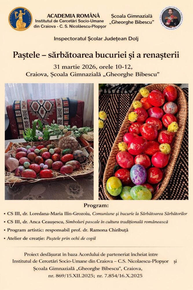 În data de 31 martie 2026, la Școala Gimnazială „Gheorghe Bibescu” din Craiova s-a defășurat proiectul cultural-educativ „Paștele – sărbătoarea bucuriei și a renașterii”, organizată de Institutul de Cercetări Socio-Umane din Craiova – C.S. Nicolăescu-Plopșor și Școala Gimnazială „Gheorghe Bibescu”, cu avizul Inspectoratului Școlar Județean Dolj. În cadrul acestuia s-au reunit specialiști în etnologie, cadre didactice și elevi, într-o incursiune în universul tradițiilor românești. Un bun prilej de a aduce laolaltă activitatea de cercetare socio-umană și cea didactică.
