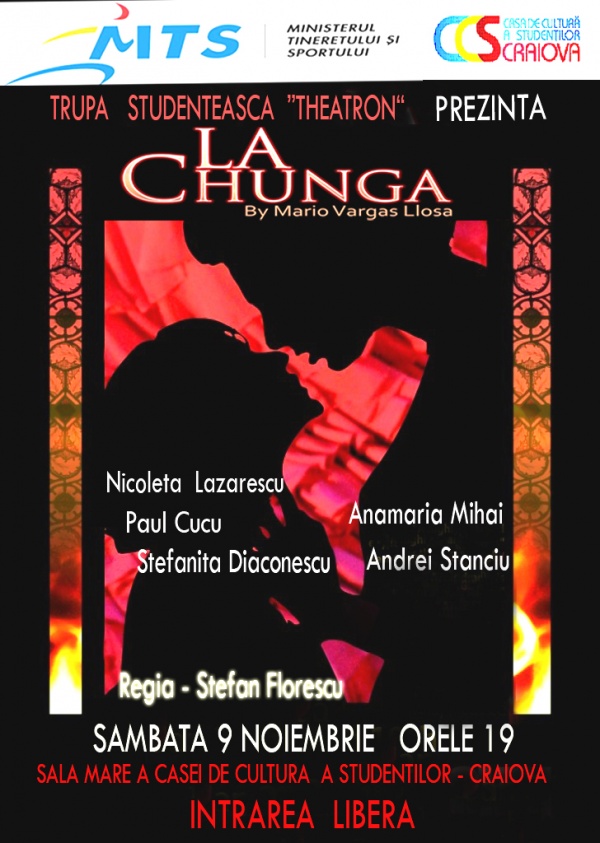 Trupa de teatru “Theatron” a Casei de Cultură a Studenţilor din Craiova va prezenta premiera spectacolului “La Chunga”, după piesa de teatru scrisă de Mario Vargas Llosa, laureat al Premiului Nobel pentru Literatură. Este adusă în scenă o lume complexă, în care cel care vorbeşte şi cel care fantasmează sunt o continuitate fără cenzură, un avers şi un revers incondfundabil, precum acele veşminte care se pot îmbrăca pe ambele feţe, aşa încât, uneori devine imposibil de spus care este faţa şi care dosul. «Piesa “La Chunga” este un labirint de îngeri şi demoni, pune întrebări, trezeşte conştiinţe si cred că poate avea un mesaj, iar acest mesaj va determina cel puţin o conştiinţă să se intrebe: de ce?», a declarat coordonatorul trupei de teatru „Theatron”, Ştefan Florescu. Premiera va avea loc sâmbătă, 9 noiembrie, ora 19.00, în Sala Mare a Casei de Cultură a Studenţilor. Intrarea este liberă.