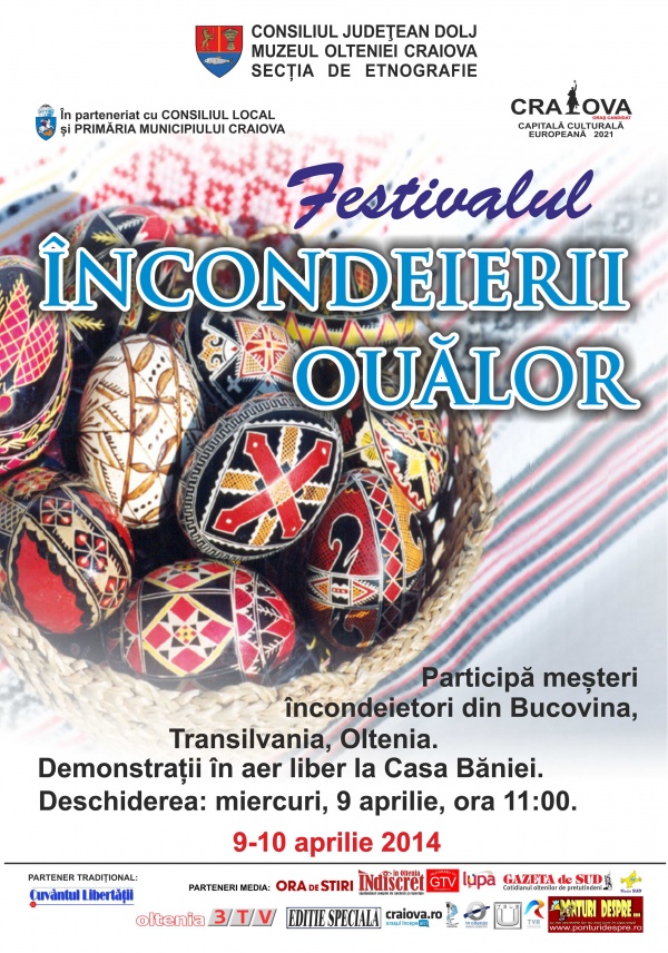 Conform tradiţiei, Secţia de Etnografie a Muzeului Olteniei organizează în Săptămâna Floriilor Festivalul Încondeierii Ouălor. Manifestarea de artă tradiţională se va desfăşura astăzi și mâine, în aer liber, pe aleea din faţa Casei Băniei. Vor participa 15 meşteri încondeietori din Bucovina (Ciocăneşti, Suceava), Braşov, Olt (Călui, Balş), adulţi şi copii, care au obţinut premii speciale în acest meşteşug, atât în ţară, cât şi în străinătate. Deschiderea oficială are loc astăzi, ora 11.00, iar programul demonstraţiilor va fi cuprins, în cele două zile, între orele 9.00-12.00 și 14.00-16.30. «Cu această manifestare culturală de tradiţie venim şi în întâmpinarea numeroaselor grupuri de elevi care în aceste zile vizitează Muzeul Olteniei în cadrul proiectul educaţional „Şcoala altfel”», au precizat organizatorii. Festivalul Încondeierii Ouălor beneficiază de sprijinul Consiliului Judeţean Dolj şi se desfăşoară în parteneriat cu Consiliul Local şi Primăria municipiului Craiova.