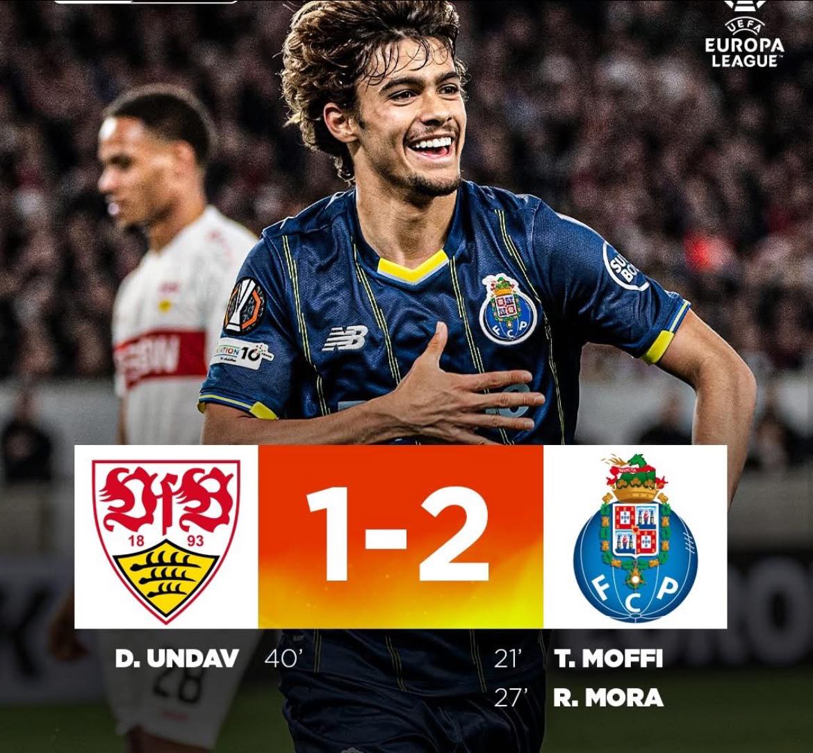2-1 cu VfB Stuttgart, pentru FC Porto, liderul primei divizii portugheze, în prima manşă a optimilor de finală ale Europei League, prin golurile realizate de Terem Moffi (min. 21) şi Rodrigo Mora (min. 27), acesta din urmă un tânăr de numai 18 ani. Pentru gazde a redus din diferenţă Denis Undav (min. 41), aflat la al 20-lea gol în toate competiţiile. Echipa din Stuttgart, locul 4 în Bundesliga, şi-a îngreunat misiunea de a merge mai departe. În schimb victoria lui FC Porto a asigurat Portugalia de locul 6 în clasamentul UEFA şi prin urmare va avea 3 echipe în Liga Campionilor 2027-2028.