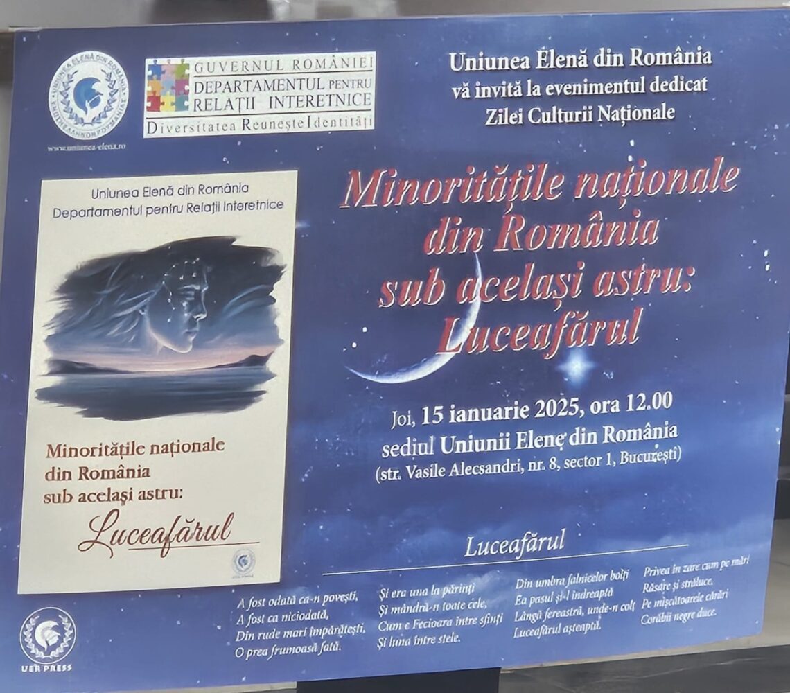 În acest context, AMR a răspuns invitaţiei lansate de Uniunea Elenă din România de a participa la un eveniment cultural organizat cu prilejul Zilei Culturii Naţionale Române, manifestare ce a reunit reprezentanţi ai mai multor minorităţi naţionale din ţară. Evenimentul a constituit un prilej de reflecţie asupra rolului culturii ca liant între comunităţi, dincolo de diferenţele etnice sau lingvistice.