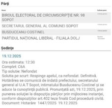 “Tribunalul Dolj a respins, astăzi, 20 decembrie, definitiv acțiunea în instanță a Partidului Național Liberal, filiala Dolj, prin care contesta validarea mandatului de primar al lui Costinel Busduceanu, câștigătorul alegerilor parțiale din data de 7 decembrie, din comuna Sopot. Costinel Busduceanu, candidatul PSD Dolj, nu s-a aflat în incompatibilitate în momentul depunerii dosarului de candidatură, iar acest lucru a fost astăzi atestat în justiție. Din păcate, acțiunea PNL nu a făcut decât să amâne validarea mandatului primarului ales și a tergiversat preluarea administrației locale de către câștigătorul de drept, în defavoarea cetățenilor care și-au exprimat votul și care așteaptă să aibă o administrație locală legitimă”, a precizat, într-un comunicat, PSD Dolj. “Liberalii dovedesc din nou că nu cunosc legislația sau aleg să o ignore cu bună știință, într-o încercare disperată de a bloca administrațiile locale acolo unde nu reușesc să convingă prin proiecte și rezultate. Sopotenii nu trebuie pedepsiți pentru că au ales un alt drum decât cel al promisiunilor goale. Este o practică veche a PNL: când nu pot câștiga pe cale democratică, recurg la tertipuri. PSD Dolj a respectat întotdeauna legea și voința cetățenilor, iar instanța a confirmat astăzi ceea ce știam cu toții, că mandatul lui Costinel Busduceanu este legal, legitim și trebuie pus în aplicare imediat.”, a declarat Cosmin Vasile, președintele PSD Dolj. Odată încheiată această tentativă de răzbunare, Costinel Busduceanu poate să depună jurământul și să preia funcția de primar al comunei Sopot.