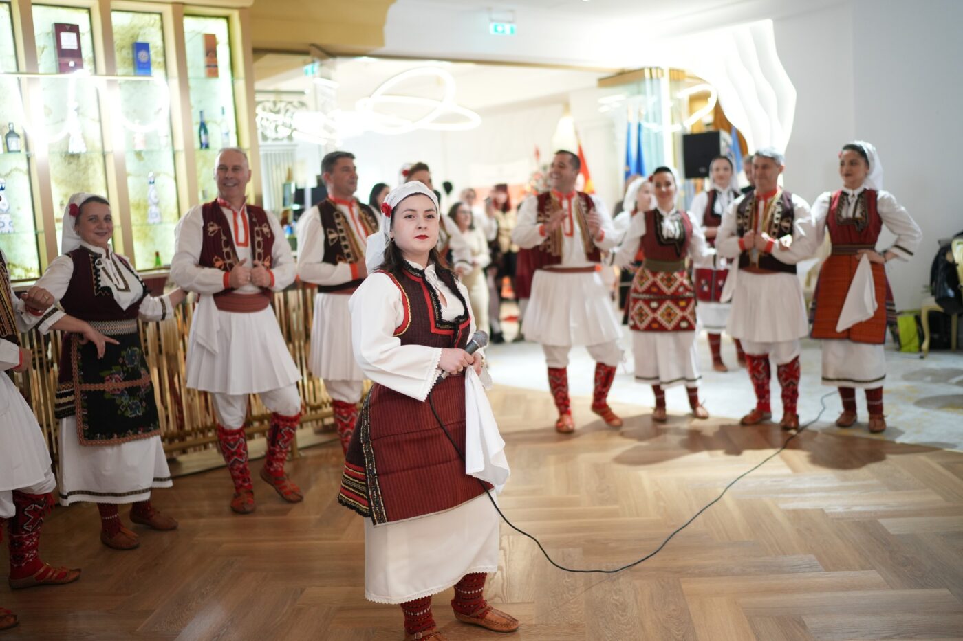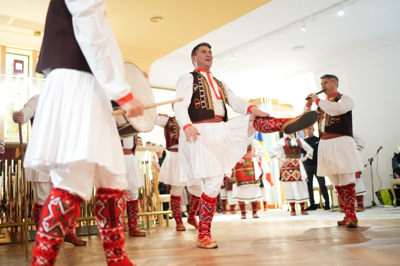 „Prin dansurile și cântecele populare tradiționale, poporul macedonean își exprimă sentimentele, bucuriile și tristețile. În funcție de stil, coregrafie și obiceiurile asociate, acestea pot fi împărțite în vestice, sud-vestice, sudice, nordice și estice. De asemenea, distingem între dansuri rituale și seculare. Cele rituale includ dansul dodol, dansul koledar, dansul rusalian etc., iar cele seculare sunt legate de viața și munca oamenilor, precum dansul de luptă, dansul nunții, dansul recoltei sau dansul iubirii. Pe teritoriul Macedoniei, în funcție de stil, coregrafie și obiceiuri, dansurile sunt împărțite în cinci grupe regionale: nordice, orientale, occidentale, sudice și sud-vestice. Dansuri precum Teshkoto, Aramiskoto sau Nevestinskoto spun povești despre dor, curaj și trecerea în noi etape ale vieții, fiind acompaniate de instrumente tradiționale”, a explicat Elena Saul Nikolova, coordonatoarea cursului de limbă și cultură macedoneană de la AMR Craiova.