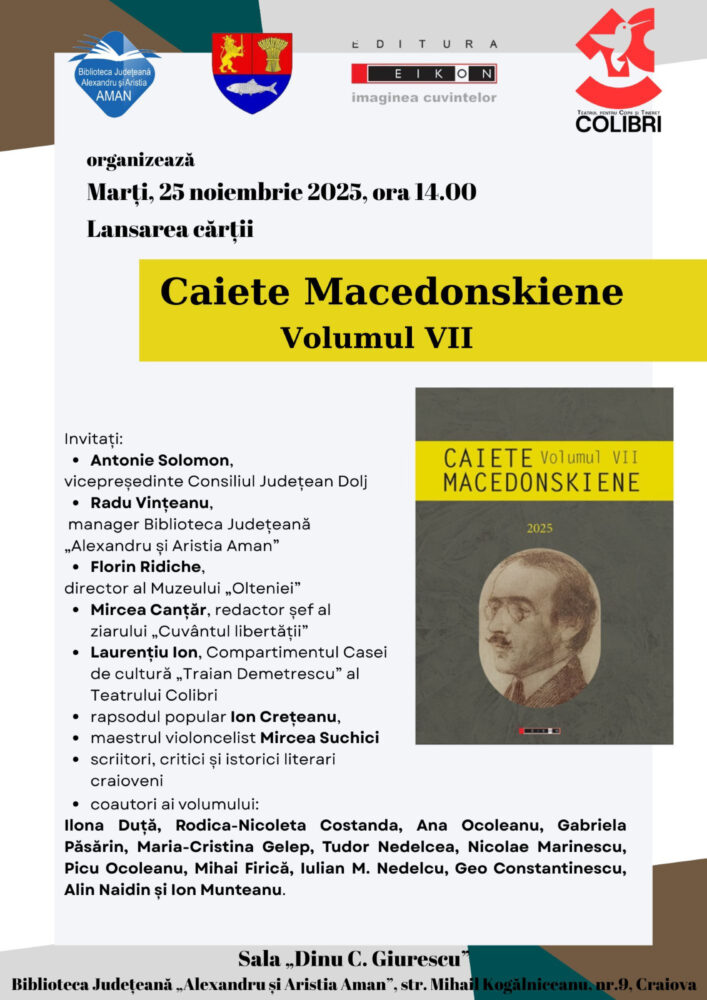 Biblioteca Judeţeană „Alexandru şi Aristia Aman” găzduieşte marți, 25 noiembrie 2025, începând cu ora 14.00, în sala „Acad. Dinu C. Giurescu”, lansarea volumului VII al Caietelor macedonskiene, recent publicat de Editura Eikon din București.