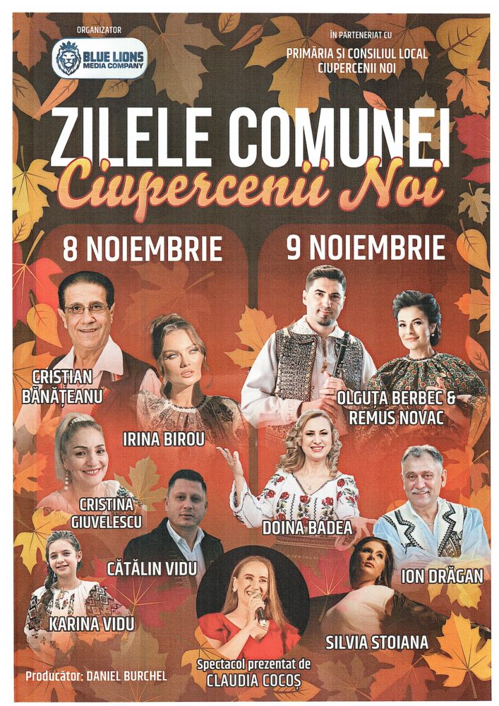 PE  DATA DE 08 – 09 NOIEMBRIE 2025 PRIMĂRIA ŞI CONSILIUL LOCAL CIUPERCENII NOI, ÎN PARTENERIAT CU S.C. BLUE LIONS MEDIA COMPANY S.R.L, ORGANIZEAZĂ ,,ZILELE COMUNEI CIUPERCENII NOI”.
