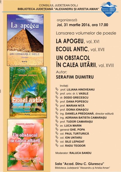 În Sala „Acad. Dinu C. Giurescu” a Bibliotecii Judeţene „Alexandru şi Aristia Aman” are loc astăzi, ora 17.00, evenimentul de lansare a volumelor „La apogeu” (vol. XVI), „Ecoul antic” (vol. XVII), „Un obstacol în caleaa uitării” (vol. XVIII), publicate în seria „Din gândurile mele” a autorului Dumitru Serafim. Evenimentul este moderat de Raluca Sandu şi îi are ca invitaţi pe prof. Liliana Hinoveanu, prof. univ. dr. I. Vasile, dr. Dodo Grecescu, prof. Dana Popescu, prof. Marian Niţă, prof. Doina Ionaşcu, ing. Daniela Predoană, ing. Adriana Batista Camaraşu, av. Luca Marin, general Ghe. Popa, col. Paul Turturică, col. Ion Untaru, col. Sile Lepădat şi col. Radu Teodor.