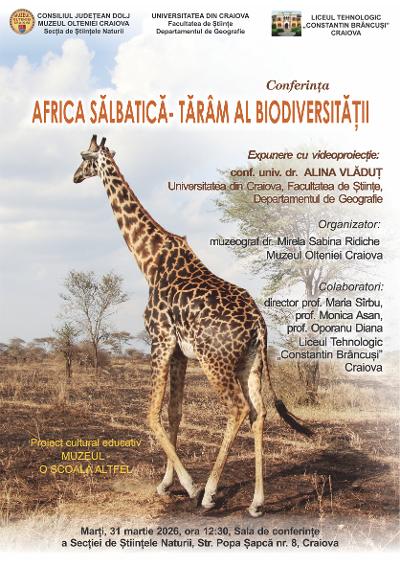 Conferința face parte din suita de activități cuprinse în Proiectul cultural-educativ “MUZEUL – O ȘCOALĂ ALTFEL”, coordonat de muzeograf dr. Mirela Sabina RidicheExpunerea a fost  susținută de conf. univ. dr. Alina Vlăduț – Universitatea din Craiova, Facultatea de Științe, Departamentul de Geografie. Aceasta a călătorit sub soarele savanei, a experimentat contactul cu inima sălbatică a Africii și a surprins cu ochi de explorator multe aspecte legate de biodiversitatea din Kenya, Tanzania și Madagascar, dar și aspecte sociale sau cu privire la relația comunităților locale cu fauna sălbatică, prezentând cele trăite. Între beneficiarii acestei manifestări sunt elevi ai Liceului Tehnologic “Constantin Brâncuși” din Craiova, aflați în Programul “Școala Altfel”, sub coordonarea prof. Maria Sîrbu (director), prof. Monica Asan și prof. Diana Oporanu, directori adjuncți.