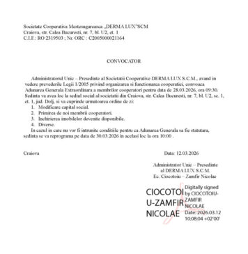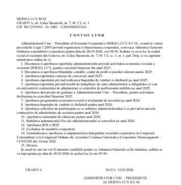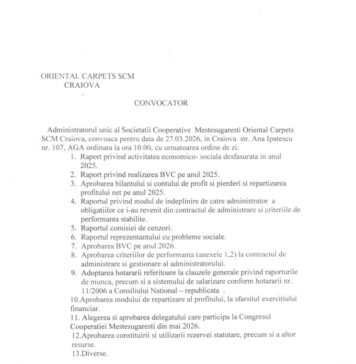 Se convoacă Adunarea generală a membrilor CECCAR Filiala Dolj, la sediul filialei, în data de 26.03.2026, ora 16,00,...